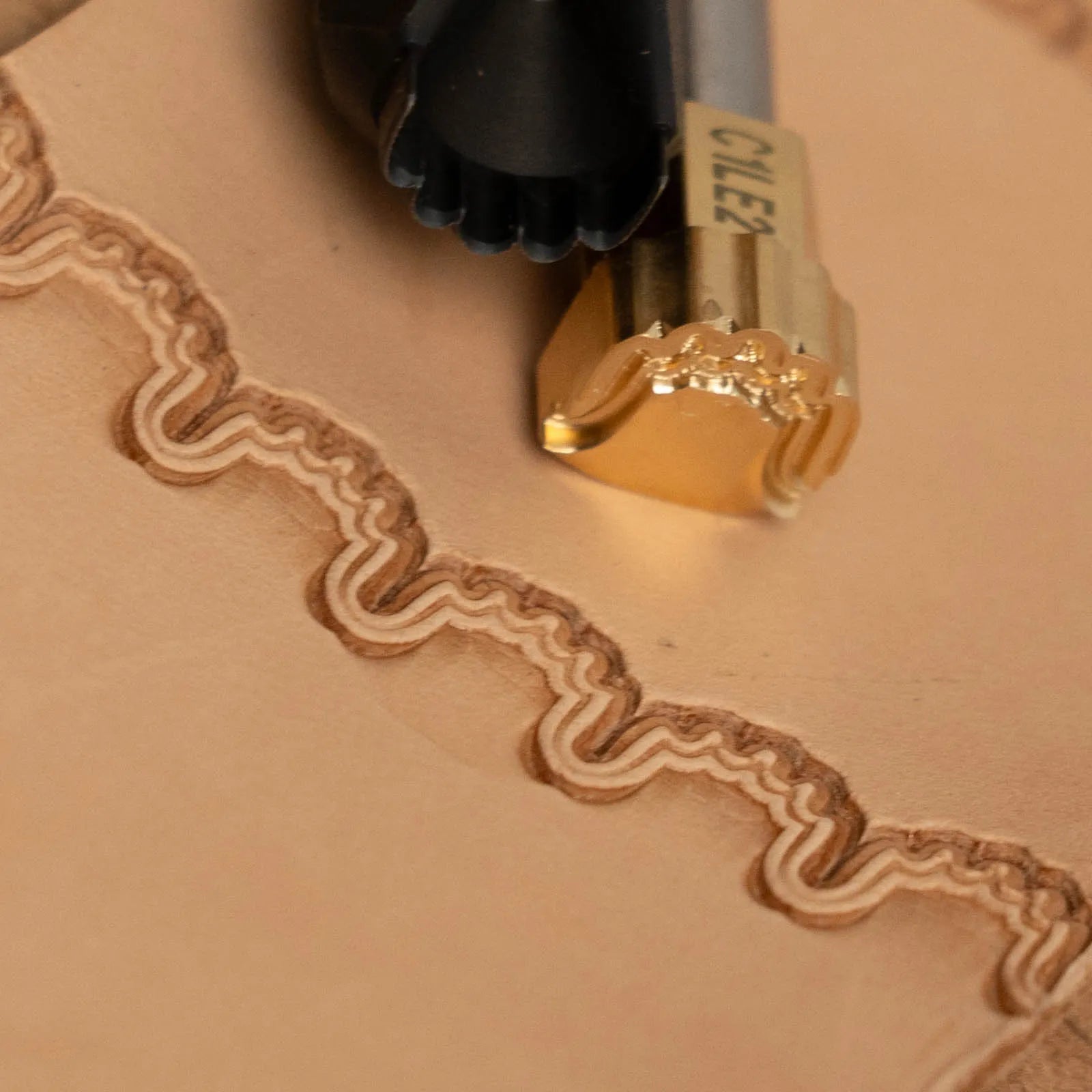 This decorative edge stamp is designed to follow the cut line after working with a leather cutter, ensuring clean and elegant edges.