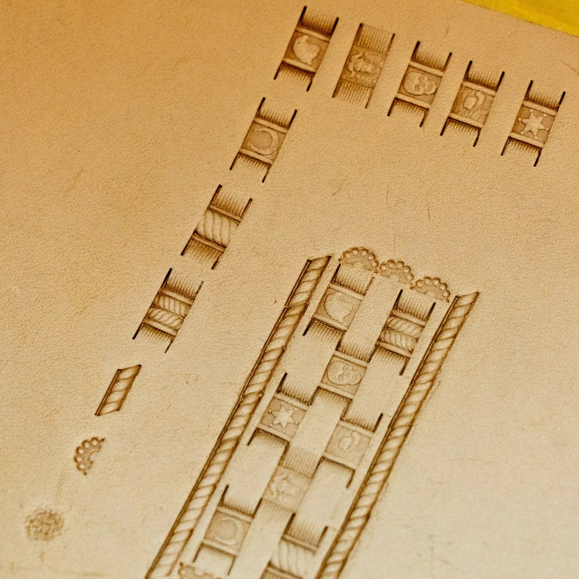 The set allows for full customization: mix and match blocks featuring Skulls, Stars, Moons, and Rams to tell a story on your leatherwork. Framed by a heavy-duty rope border, this modular system is perfect for crafting custom biker belts, guitar straps, and rugged holsters.
